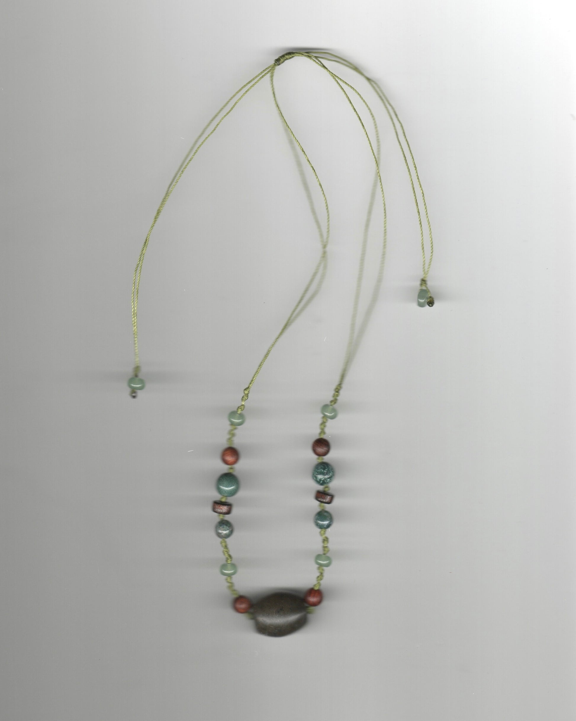 Dark green barrel pendant with wood and agate beads on green waxed cord.