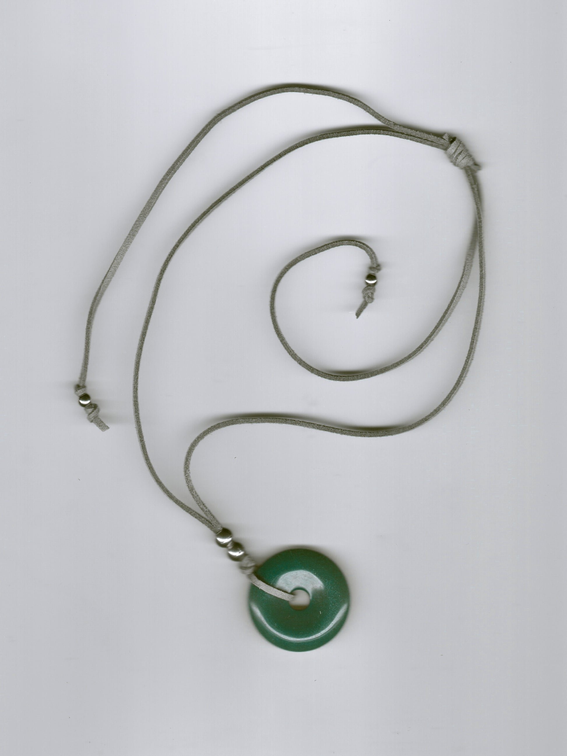 Grey suede cord with stainless steel beads and a faux Jade donut pendant.